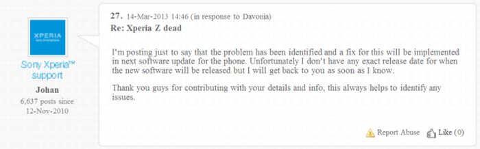 Ismét gyári hibáról lehet szó, a frissen bemutatkozott Sony Xperia Z, a japán gyártó zászlóshajói közül több rejtélyes körülmények között adja be a kulcsot és lesz belőlük igen drága, de legalább vízálló levélnehezéket. Több fórumra is felkerültek a felhasználók negatív élményei a hirtelen elhalálozásról. A modellek egyszerűen, használat közben egyszer csak kikapcsolnak és soha többé nem lehet bekapcsolni. Néhány szerencsés embernek a hard reset (bekapcsoló gomb és hangerő fel) felélesztette a telefont, de többeknek nem. A hiba nem függ az akkumulátor töltöttségétől. A Sony Mobile már tud a hibáról és a support oldalon azt írták, egy későbbi szoftverfrissítés megoldja a gondot.