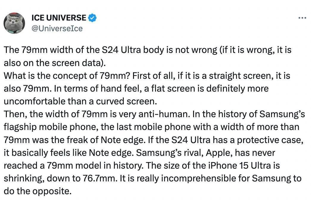 Korábban már beszámoltak arról, hogy a Galaxy S24 Ultra dizájnja egy kicsit felfrissülhet, most pedig a kiszivárogtató Ice Universe további tervekkel szolgált. Ice korábban azt mondta, hogy a Galaxy S24 Ultra lapos képernyőt kap vastagabb keretekkel és kissé kerekebb oldalkerettel. Azt is állította, hogy a kijelző képaránya 19,3:9-ről 19,5:9-re változik, és hogy a telefon egy kicsivel rövidebb lesz, mint a Galaxy S23 Ultra, de szélesebb és vékonyabb.