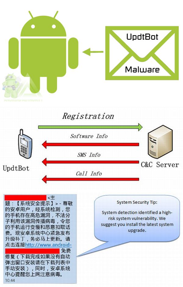 A vírus természetesen ezúttal is a felhasználók jóhiszeműségére alapozta a terjeszkedést, hiszen önálló vírus nem létezik Androidra. Az NQ Mobile Security Research Center által felfedezett károkozót UpdtBot (Update Bot) névre keresztelték. Az áldozatok SMS-ben kapnak egy linket, amely szerint rendszerfrissítésre van szükség és ezt a linkre kattintva gyorsan megtehetik - itt lép be ugyebár a jóhiszeműség a képbe, hiszen ugyan milyen gyártó/szolgáltató küld SMS-ben erről üzenetet? A linkre kattintva persze az UpdtBot kerül telepítésre, amely innentől kezdve hozzáfér az üzenetekhez, telefonkönyvhöz, SMS-eket küld és hívásokat intéz a háttérben, valamint letölt egyéb alkalmazásokat is. Az NQ Mobile szerint jelenleg mintegy 160 ezer készülék lehet fertőzött, így ismét fel kell hívni minden mobiltulajdonos figyelmét, hogy csak és kizárólag megbízható forrásból telepítsen bármilyen alkalmazást a telefonjára! Az UpdtBot ezúttal is Kínából indult.