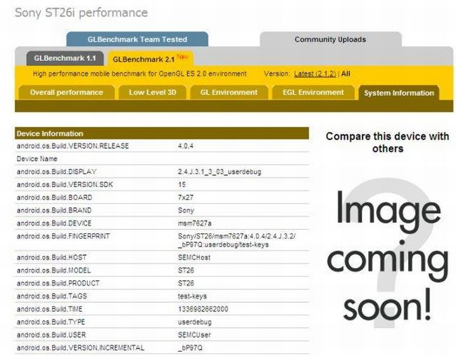 Régóta pletykálnak a Sony ST26i kódnevű mobiljáról, ezúttal benchmark programban is felbukkant, így eddig ismeretlen információk is kiderültek a készülékről. Az OpenGL tesztprogram szerint a hivatalosan be nem mutatott mobilon Android 4.0 Ice Cream Sandwich rendszer fut, a 4 colos érintőkijelző 854×480 képpont felbontású. Az olcsó Qualcomm MSM7627A processzor 800 megahertzes órajelen ketyeg, ezt egészíti ki egy Adreno 200 grafikai gyorsító. Érdekes, hogy eddig CPU tekintetében egy kétmagos, 1 gighertzes ST-Ericsson U8500 chipről volt szó, a jelek szerint azonban az ár csökkentése érdekében feláldozza a Sony a tudást is kissé, hogy versenyképes maradhasson.