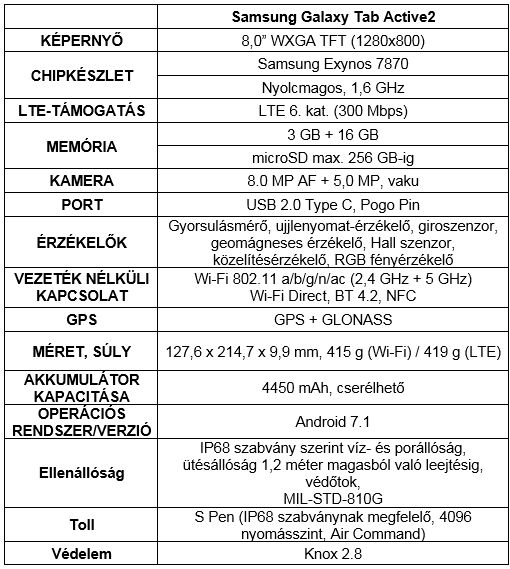 A készülék támogatja az LTE-kapcsolatot, az egyszerű és kényelmes töltést, több eszköz akkumulátorának hatékony ellenőrzését, illetve különleges adatcsatlakozókat is biztosít a külső billentyűzetek használatához. A Samsung Galaxy Tab Active2 kiemelt biztonságot kínál a vállalatoknak a legszigorúbb szabványoknak megfelelő Knox platformok integrálásának és a biometrikus azonosításnak köszönhetően. Az újgenerációs ujjlenyomat-leolvasóval ellátott készülék nagyobb védelmet biztosít, valamint arcfelismerésre is képes. Az LTE-képes Samsung Galaxy Tab Active2 készülék várhatóan 2018 elején érkezik Magyarországra.