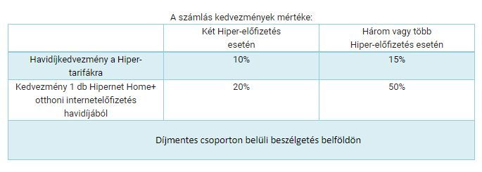Az így alakított HiperCsoportba bevonhatók a számlás Telenor XS és S, valamint a feltöltőkártyás Hello Kártyás tarifacsomagok is. A csoport tagjaiként a számlásoknak díjmentesen, míg a kártyásoknak 1390 forint/30 nap időszaki díjért ingyenes és korlátlan csoporton belüli beszélgetés jár. Emellett HiperCsoportonként egy, otthoni internetes Hipernet Home+ előfizetés is bevonható a csoportba, amelyre így 20%, vagy akár 50% havidíjkedvezmény jár.