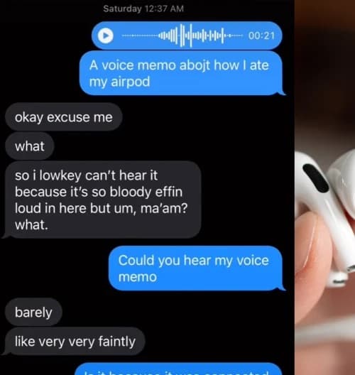 Következésképpen a barát hangüzenetet kapott az összes gurgulázó hanggal, amelyet az AirPod rögzített, miközben lefelé haladt, hogy végül a természetes úton hagyja el a lány testét. Még véletlenül se utánozzátok! Nem jó ötlet!