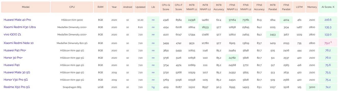 Mint látható, a lista tetejét a Kirin és a Dimensity lapkakészletek uralják, a Snapdragon 865 (a Realme X50 Pro 5G-nél) csak csekély, 74,2 pontot tudott szerezni.