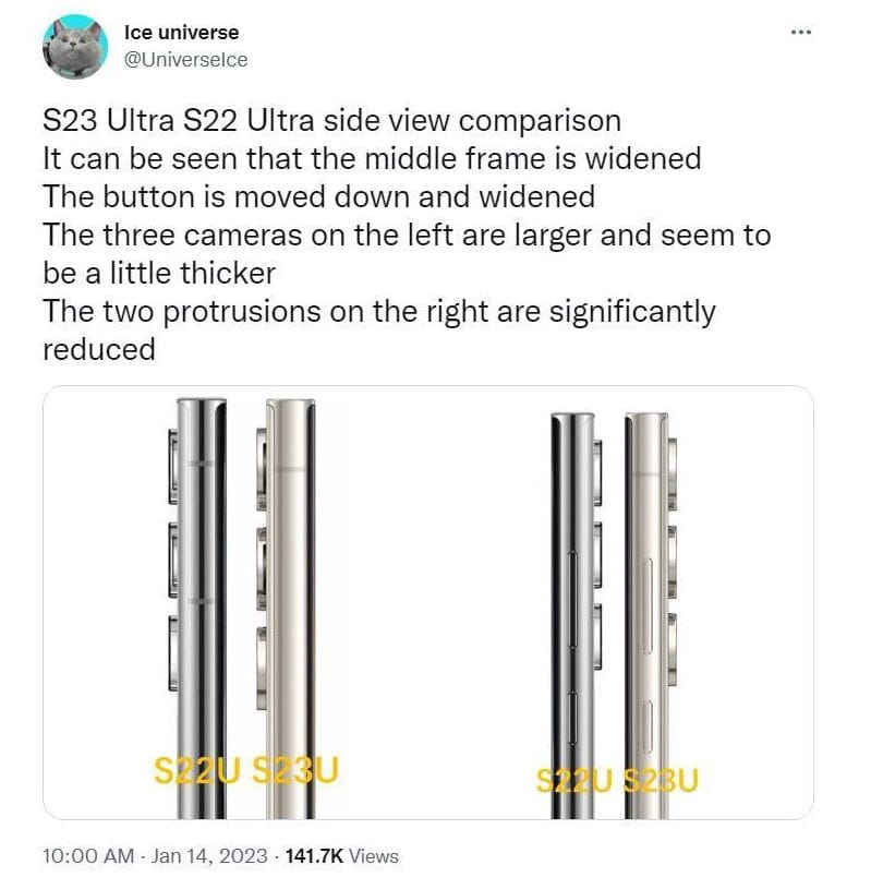A Galaxy S23 Ultra hátulját is láthatjuk, és úgy tűnik, hogy még dobozosabb kialakítású, mint az S22 Ultra, az oldalai is laposabbak. Bár ezekről a képekről nehéz megállapítani, a Galaxy S23 Ultra nagyobb kameraérzékelőkkel rendelkezik-e, mint a Galaxy S22 Ultra, az általános megjelenés azonban nagyon hasonlít az elődhöz.
