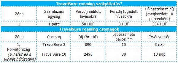 A Telenor augusztusban új roaming szolgáltatást indított, amellyel kedvezményes percdíjakkal, hívásszakasz-díj mellett lehet telefonálni az 1-es díjzónába tartozó országokban. A szolgáltató bevezetett egy 3 és egy 10 napos roaming csomagot is: ezek az 1-es díjzónán túl Horvátország egyes hálózatain is érvényesek. A mobilszolgáltató kártyás és számlás előfizetők számára egyaránt elérhető TravelSure roaming szolgáltatását nem csak a nyaralóknak, hanem a külföldre gyakran utazóknak is ajánlja. A havidíjmentes TravelSure roaming szolgáltatás megrendelése esetén az ügyfelek 50 forintos percdíj és 10 percenkénti hívásszakasz-díj mellett kezdeményezhetnek hívást az 1-es díjzónából vagy telefonálhatnak az adott ország hálózatán. A hívásfogadásra ráadásul a 10 percenkénti hívásszakasz-díj megfizetése mellett további díjfizetés nélkül van lehetőség.