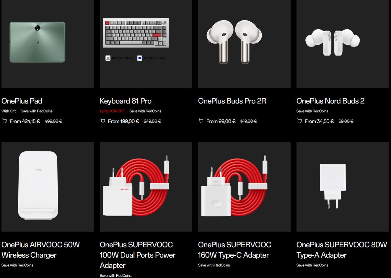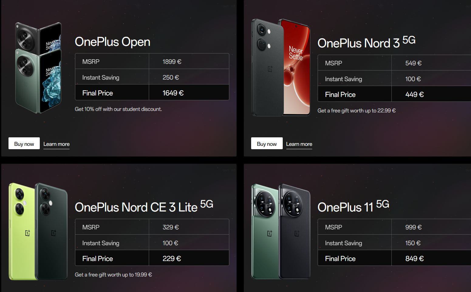 A telefonok közül a OnePlus Open 1899 euró helyett 1649 eurós áron szerezhető be, a OnePlus Nord 3 5G 549 helyett 449 euróért kapható, a OnePlus Nord CE 3 Lite 5G 329 euró helyett 229 euró, a OnePlus 12 érkezése előtt pedig már most olcsóbb a OnePlus 11 5G 999 euró helyett 849 euróba kerül. Olcsóbb lett a OnePlus Pad táblagép is, 499 euró helyett 424.15 eurótól szerezhető be.