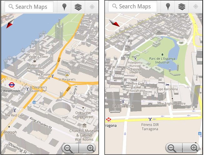 Több nagyváros új térképeket kapott, immár 3D nézetben is navigálhatunk a Google Maps-ben Londonban, Párizsban, Barcelonában. Múlt év decemberében mutatta be a Google a Maps 5.0 verziószámát, amely végre támogatja a 3D nézeteket. A fenti három városon kívül elérhető még a háromdimenziós nézet New Yorkban, Zürichben, Milánóban, Stockholmban, Lisszabonban és több egyéb nagyvárosban is. Az új térképek használatához ezúttal nem szükséges külön frissítés, a Google Maps egyszerűen a legújabb térképeket használja majd navigáláskor. Egyetlen kitétel, hogy legalább Android 2.0 rendszer és a mindenkori legújabb Maps szükséges mobilunkon a 3D-s nézet használatához.