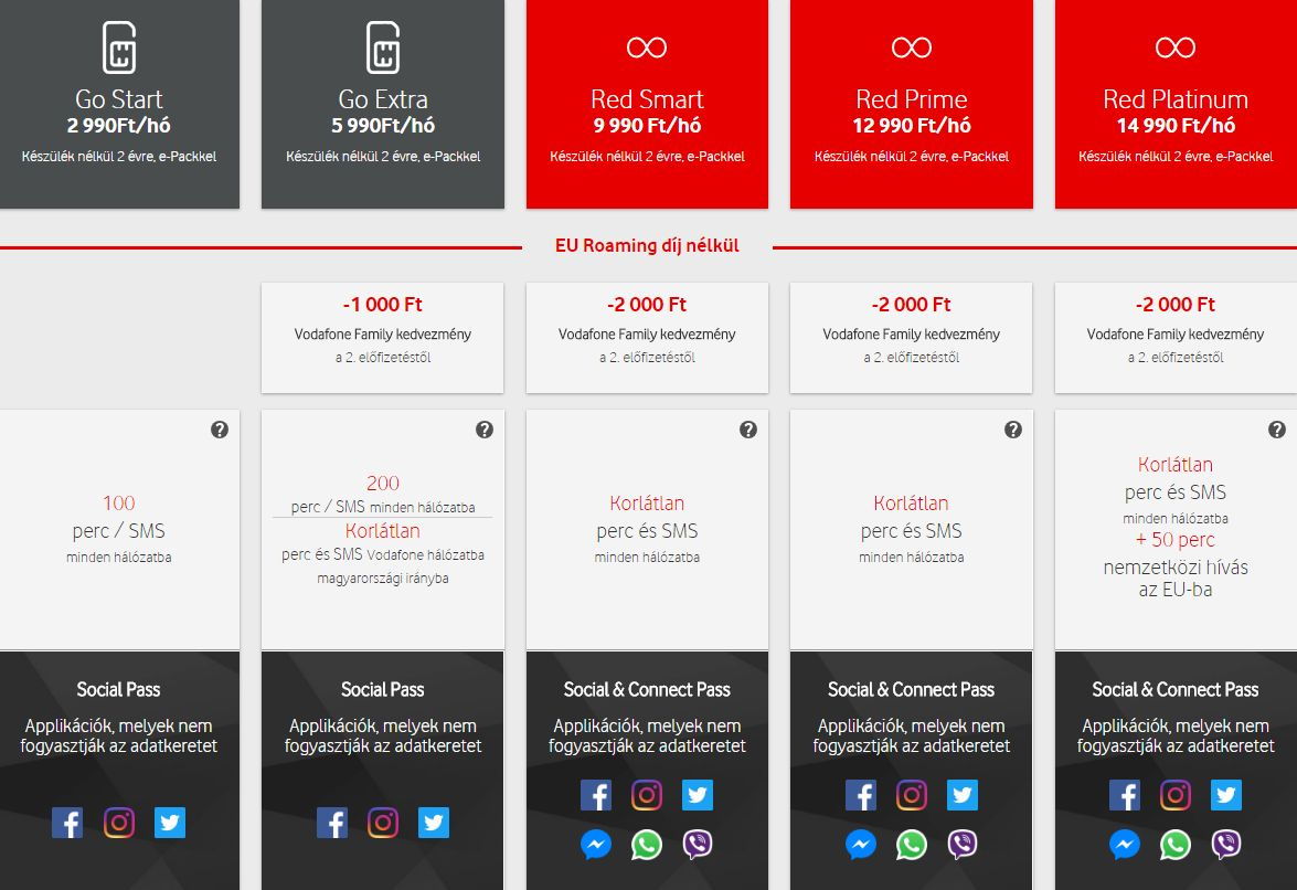 A Vodafone Go csomagokban a Social Pass révén korlátlan a Facebook, az Instagram és a Twitter használata, a Vodafone Red csomagokban pedig a közösségi oldalak mellett a Connect Pass által a Facebook Messenger, a WhatsApp és a Viber használata közben sem kell az ügyfeleknek az adatkeret miatt aggódniuk, függetlenül attól, hogy chatelés, videóhívás vagy live streaming funkcióban használják az említett platformokat.