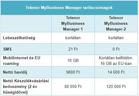 - A Telenor MyBusiness Manager tarifákkal korlátlan belföldi beszélgetést és mobilinternet egyaránt igénybe vehetnek.