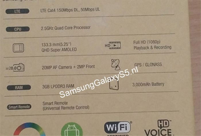 Naponta több tucat Galaxy S5 hírmorzsákat olvasunk, most sincs ez másként, ám ezúttal külön apropója is van a hírnek. Az alábbi képen állítólag a Samsung Galaxy S5 doboza látható, méghozzá a tudáslistával együtt. A hírt ma reggel kapta a SamMobile egy nevét eltitkolni kívánó olvasótól. A doboz egyezik az S4 és a Note 3 újrahasznosított anyagokból készített változatával, ám nem is ez a lényeg, hanem az, amit a listában olvashatunk. Ezek szerint a Samsung Galaxy S5-ben lesz