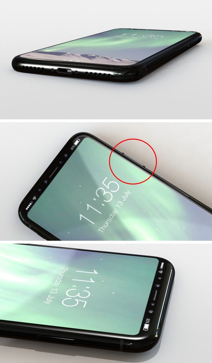Ezek szerint 5.8 colos OLED kijelzőt kap az Apple iPhone 8, a keret mindössze 4 mm vékony lehet, így még jobban kézre áll majd, akár a Samsung legújabb csúcsmodelljei. Alul jól látszik, hogy jack nincs, helyette Lightning port van és marad, bár akár még C típusú USB portot is kaphat a telefon, ennek oka a gyorstöltés megjelenése lehetne. Fontos részlet, hogy az Apple iPhone 7 Plus-hoz képest lényegesen kisebb akkumulátort kap az iPhone 8. Nagyobb képernyőzár gombbal rendelkezik az iPhone 8, ugyanis ebbe rejtik a Touch ID ujjlenyomat-olvasót, ha a kijelzőbe épített változatot nem lehet megoldani a megjelenésig.