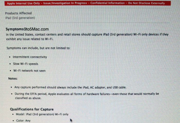 Az új Apple iPad megjelenése sem mentes a gyermekbetegségektől, újabb hibára derült fény. Az első hiba a készülékek túlmelegedése volt, a legújabb bug pedig a Wi-Fi-vel kapcsolatos. Már az AppleCare is rendelkezik saját dokumentummal a hibásan működő Wi-Fi egységekről és az eljárás során a szerviznek biztosra kell mennie, hogy nem szoftveres, hanem hardveres a hiba, így lehet cserélni a teljes készüléket a hibát produkáló iPad-ek esetében (ha minden, gyárilag csomagolt alkatrésszel együtt viszi vissza a vásárló). A Wi-Fi hibája egyébként többféle is lehet, nem csatlakozik egyáltalán a hálózatra, mert nem találja azt, esetleg túl gyenge a jel, holott a jelerősség rendben van vagy irreálisan lassú a le- és/vagy a feltöltés. A fórumokat olvasgatva kiderül, hogy rengeteg iPad-et érint a dolog, ez nem egy kis széria hibája, valamint az is egyértelmű, hogy a 4G LTE-támogatást élvező iPad-eket egyáltalán nem érinti a Wi-Fi bug.