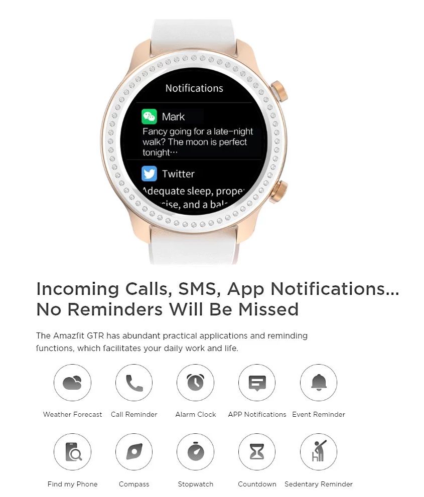 Az Amazfit GTR 12 sport módot ismer az úszástól a síelésig. Az Amazfit GTR a Huami által fejlesztett BioTracker PPG biológiai optikai érzékelővel és algoritmussal teljes körű pulzusszám monitorozást kínál. Ez nem csak nagy pontosságú, folyamatos pulzusmérést biztosít, hanem rezgéssel jelez a túl magas pulzusszám esetén. Természetesen nem csak sportra használható az óra, jelzi a bejövő hívásokat, az SMS-eket, az alkalmazások értesítéseit egyaránt.