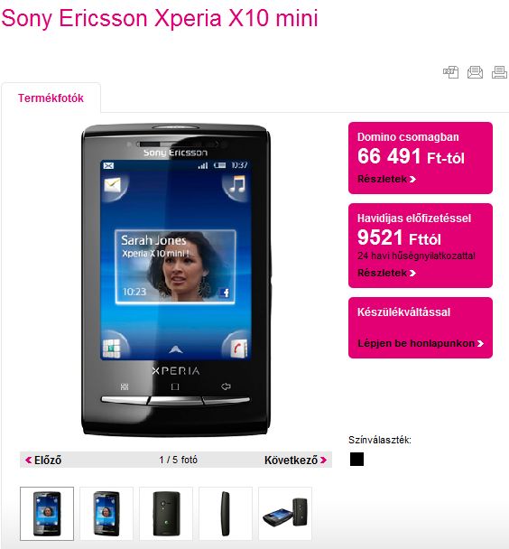 A magenta színû szolgáltató felvette készülékkínálatába a japán-svéd gyártó egyik legjobban várt mobilját. Így - ahogy arról Twitteren is hírt adott a cég - mától kapható az androidos Sony Ericsson X10 Mini! A telefon Domino csomagban már 66500 forinttól elérhetõ, míg két év hûséggel akár 10 ezer forint alatti kezdõösszegért is hazavihetõ, de rendkívül sokféle konstrukció közül választhatnak a vásárlók. Bõvebben a T-Mobile honlapján érdeklõdhetnek az akcióról.