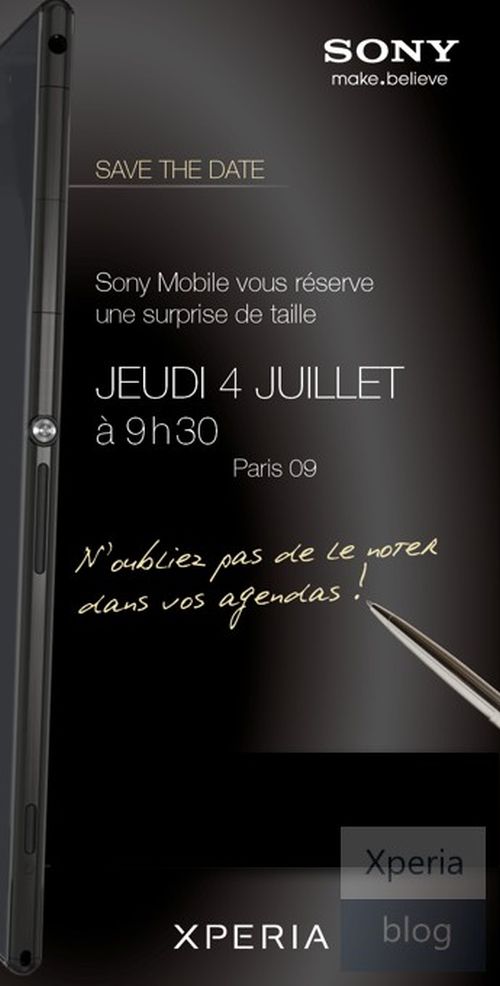 A japán gyártó legújabb sajtómeghívóján a Sony Xperia Z Ultra phablet egy részlete látható. A Sony Press küldte szét a meghívókat Franciaországban, a rendezvény július 4-én, délelőtt kerül megtartásra. A szlogen: „A Sony Mobile valami igazán nagy meglepetéssel készül”, itt a nagy szón van a hangsúly. Sokat mond a gépelt és kézzel írt szöveg is, így teljesen biztos, hogy a Samsung Galaxy Note széria kap az Xperia Z Ultra képében egy új konkurenst. A fotó szerint a modell rendkívül vékony lesz, a pletykák szerint alig 6.5 mm, amely új rekord lehetne. A telefon oldalán látható fent a 3.5 mm-es jack port, a microSD és microSIM kártyájának helye jól védve, a bekapcsológomb, mely egyben képernyőzár, ennek elhelyezkedése ugyanilyen minden friss Xperia mobilon, ezek alatt a hangerőgomb látható, míg legalul egy kisebb lyuk látható, talán valami tartó helye.