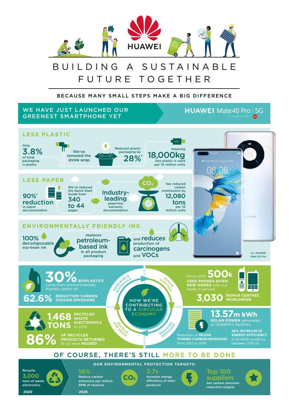Száz százalékban lebomló, szójabab alapú festék és ricinusolajból származó bioműanyagok felhasználásával lett környezetbarátabb a Huawei Mate 40 Pro doboza. A vállalat elkötelezett az ökológiai lábnyoma csökkentésében, ennek eredményeként a Mate 40 Pro, az új zászlóshajó modell 28 százalékkal kisebb csomagolásban, 90 százalékkal kevesebb papírtartalommal, csupán 3,8 százalék műanyagtartalommal és világelsőként, papír nélküli garanciával érkezik. A gyártó törekvései szerint 2025-re teljesen eltűnhet a műanyag a csomagolásokból és a papír alapú kézikönyvek is.