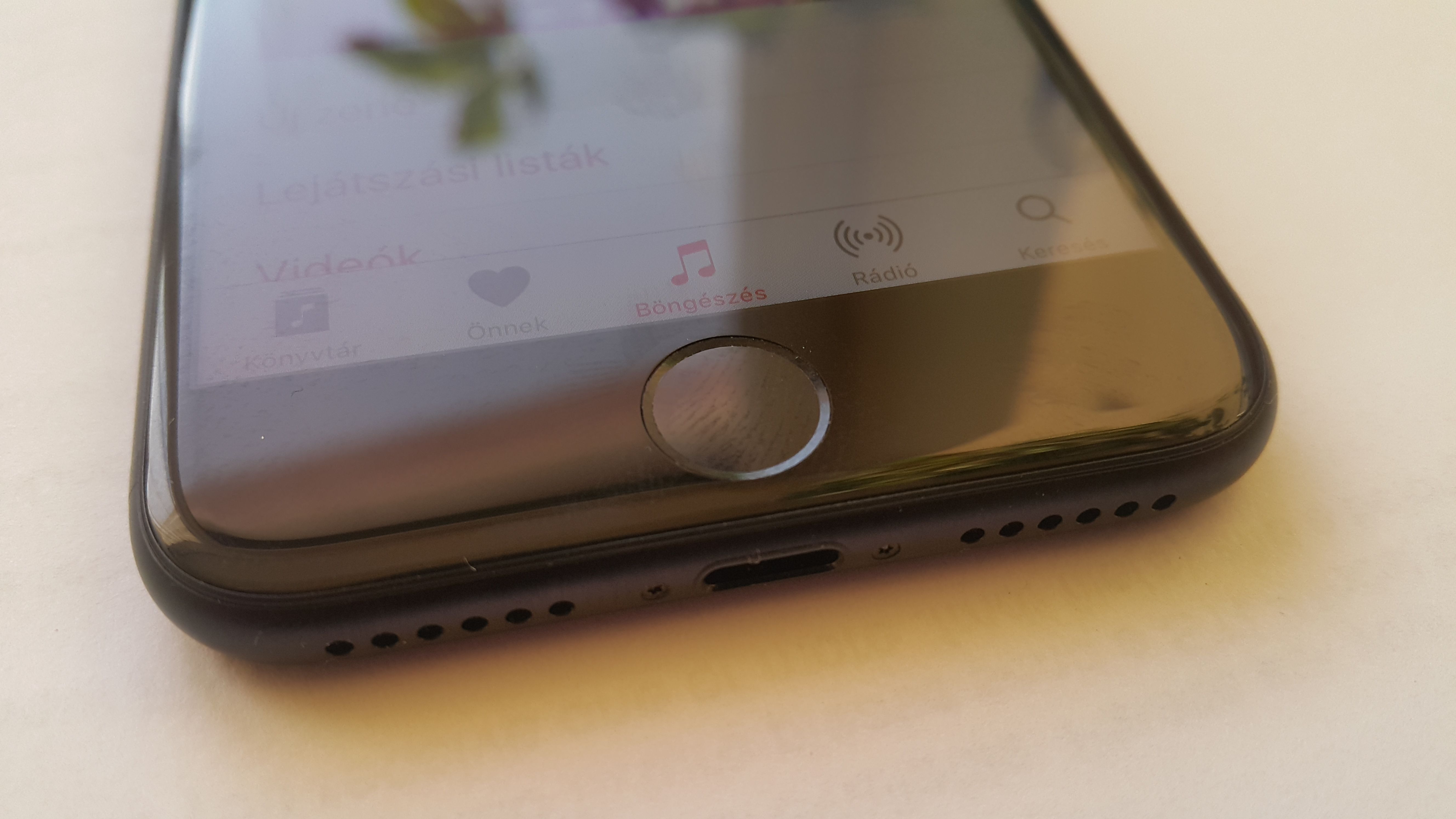 Itt találjuk még a már említett, újfajta home gombot, benne a Touch ID ujjlenyomat-olvasóval. A Home gomb érdekessége, hogy valójában már nem is gomb, csak egy darab a burkolatból, amely nem benyomható fizikailag, egyébként érzékeli a nyomást is, hiszen összekötötték a TapTic motorral. Ennek megfelelően meg tudja különböztetni a nyomást és az érintést. A TapTic motor hibátlanul működött minden alkalommal, a visszajelzés erőssége három fokozatban állítható. Tény és való, régebbi iPhone-ról kell pár nap az átálláshoz. Meglepő lehet, de többeknek új jött le ez az újítás, mintha csak az újdonság kedvéért módosította volna az Apple a home gombot, nem pedig a valódi innováció miatt. Szubjektív meglátás. És még a jack-et is kiszorította. Fontos szempont lehetett viszont, hogy így nem kell foglalkozni a hibás home gombokkal és a hírhedt Error 53-as hibával, valamint a ki-tudja-ki-által-cserélt hardverrel sem. Aki szereti az összefüggés elméleteket, elgondolkodhat azon, hogy vajon az Apple azért tüntette-e el a jack-et, hogy a Bluetooth-os AirPods headset felé terelje a népet, hiszen azért további 159 dollárt el lehet kérni. Ki tudja?