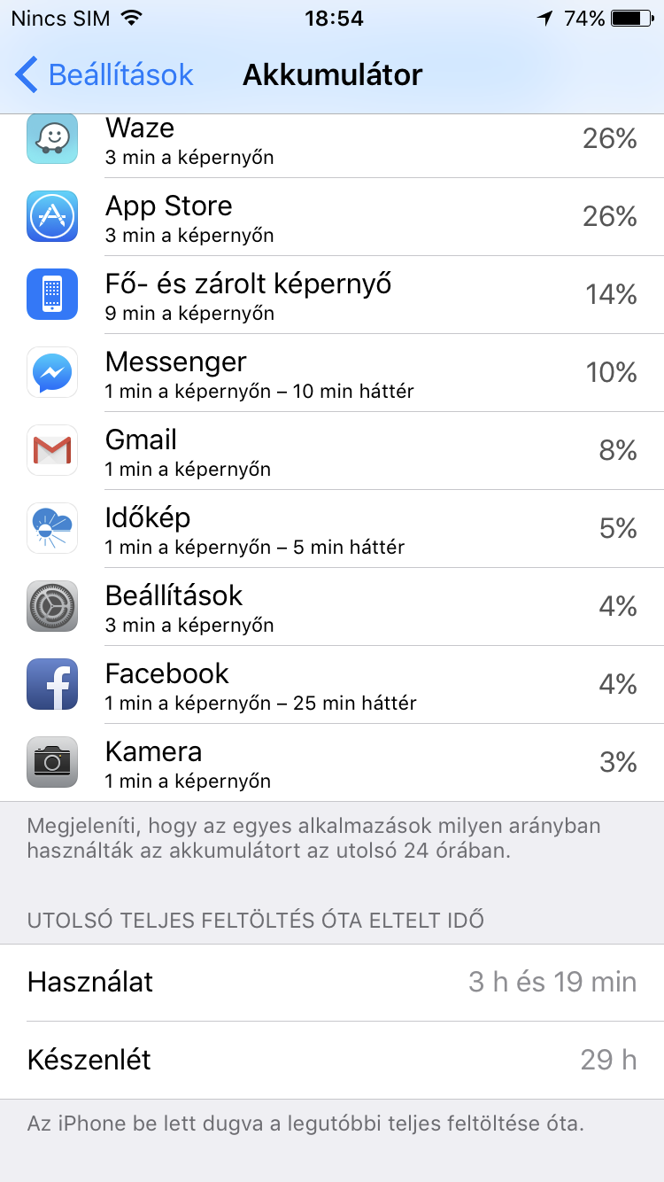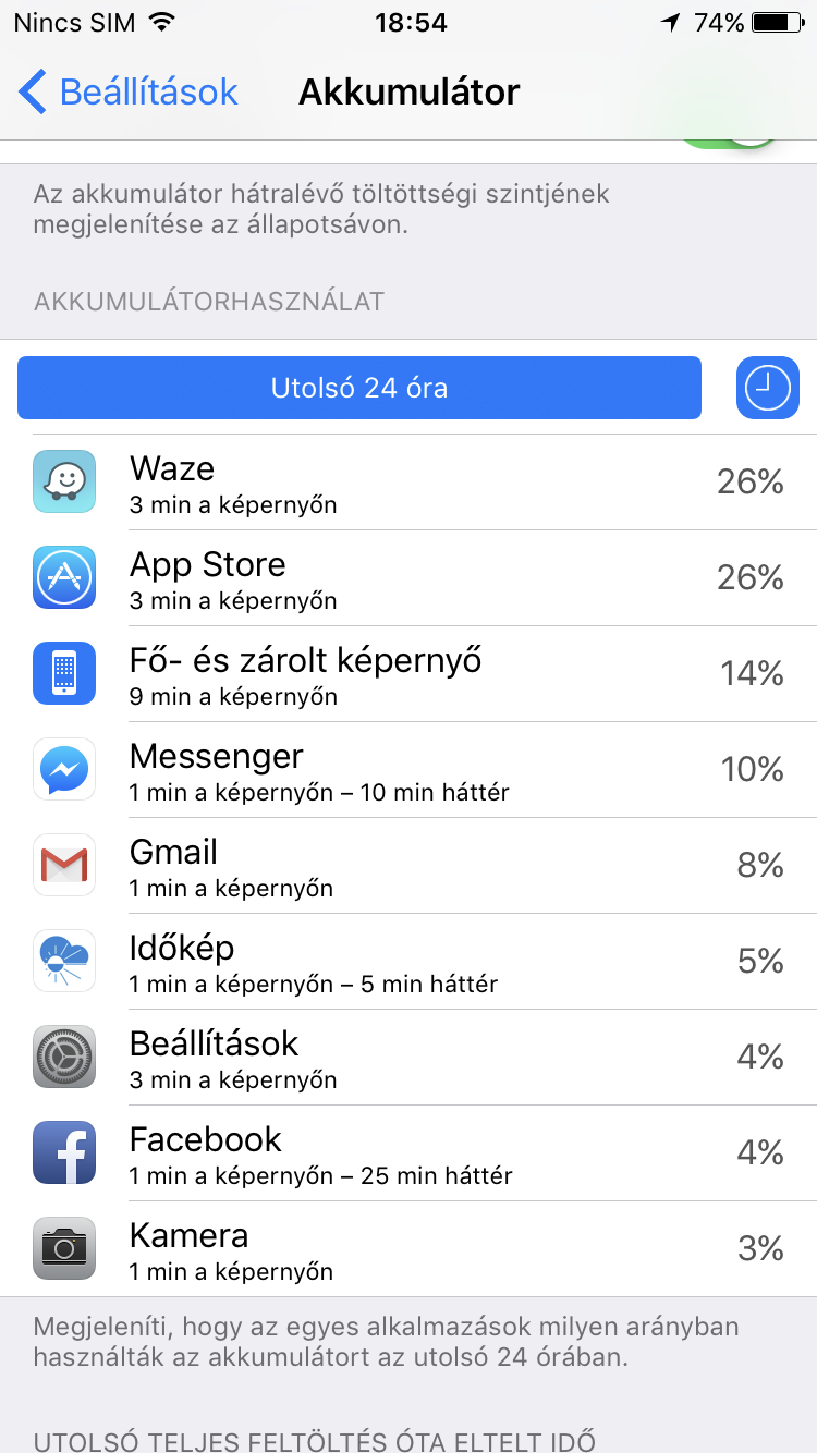 Az Apple iPhone 7-be egy nem cserélhető, 1960 mAh-s akkumulátor került, ez tizenöt százalékkal nagyobb kapacitású mint elődje. Ehhez tartozik az energiatakarékos Apple A10 Fusion processzor és a szintén akkumulátorkímélő iOS 10, így tehát sokkal jobb üzemidőt kellene kapnia a felhasználónak mint a korábbi telefonjainál. Ehhez tartozik még az akkumulátor alacsony töltöttsége esetén bekapcsolható funkció húsz százaléknál. Legnagyobb meglepetésünkre azonban a nálunk járt iPhone 7 katasztrofálisan teljesített. Egyetlen teljes napot sem tudtunk vele végigcsinálni töltés nélkül. Egyik éjszaka éjfélkor 77 százaléknál tettem le az ágyra (SIM nélkül akkor és Wi-Fi kikapcsolva), reggel 6.40-re 40 százalékon volt kereken. 10 órára sípolt, hogy 20 százalék alá ért. A hangjelzés miatt szedtem ki a táskából, érintetlen volt. Akkor a - telepített, ám el sem indított - Waze szívta le az akkumulátort, uninstall megvolt.