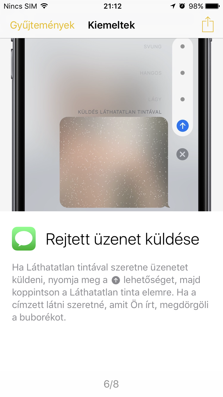 Nem sok minden változott az üzenetek küldésénél, viszont immár küldhető támogatott készülékre animált üzenet és lehet az adott szöveget feltűnően, halkan is küldeni, ezeket is effektekkel oldja meg az Apple. A leghelyesebb azonban talán mégis az ötféle lehetőség, lufival, lézerrel, tűzijátékkal való üzenetküldés, valamint a kézírás és a láthatatlan tinta támogatása. Link vagy YouTube videó küldésekor automatikusan előnézetet készít az iPhone és még matricák is küldhetők.
