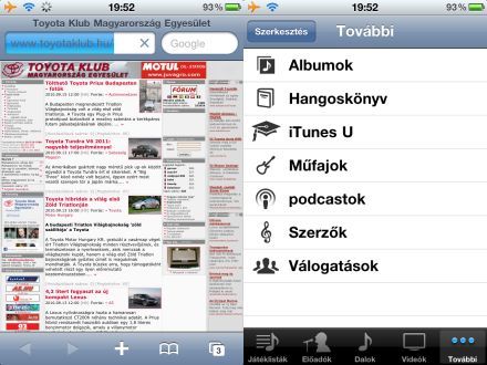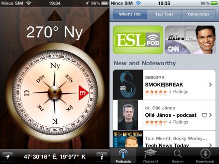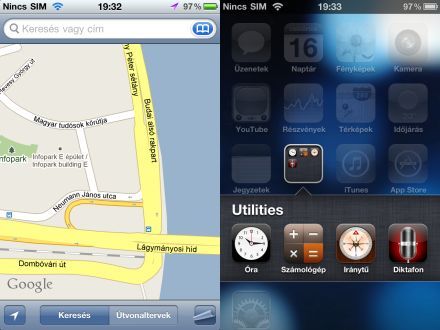 Eszközök mappa néven találunk további négy ikont, ezek az óra, a tudományos funkciókat is kapott számológép, az iránytű és a hívás közben nem használható diktafon. Az órában ott a világóra, az ébresztő, a stopper és az időzítő, végre valaki egy helyre pakolta ezeket a funkciókat és nem a menüben összevissza kell keresni. Riasztásból többet is rögzíthetük, van ismétlődésre lehetőség, valamint szundi opció. Totál döbbenet, de kikapcsolt állapotban nem ébreszt az iPhone 4. No comment.