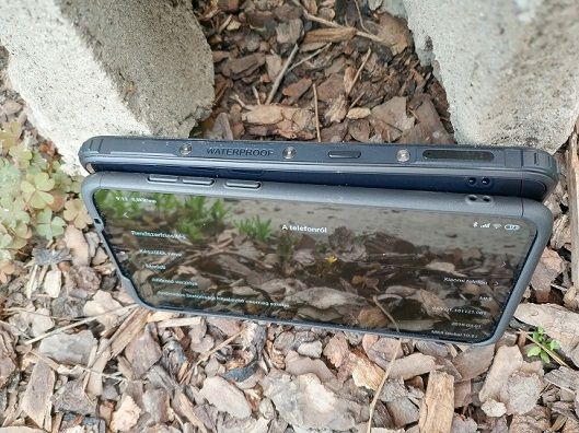 Bal oldalra a hibrid dualSIM megoldással operáló SIM-tálca és egy programozható gomb került, amit megnyomva a kamera, nyomva tartva pedig egy általunk választott alkalmazás indítható. A sarkoknál lévő extra védelem jól jön, mert általában a sarkára esik a telefon. A csavarok között feszítő „WATERPROOF” felirat is diszkréten jelzi a készülék hovatartozását.