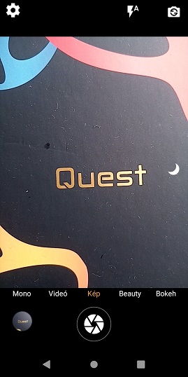 A kamera szoftver egyszerű és könnyen kezelhető. Van pár extra funkció, választhatunk a Mono, az Arcszépség, a Bokeh,az Éjszakai és Pro módok között. A Camera2 API támogatás adott, a RAW mentés azonban nem támogatott. Az érzékenységet, az expozíció-korrekciót és a sémás fehéregyensúlyt kézzel is beállíthatjuk a Pro módban. Hasznos funkció az önműködően bekapcsolódó éjszakai mód, amely a fentebb lévő képen, a Quest felirat mellett is látható, hold ikon jelez.