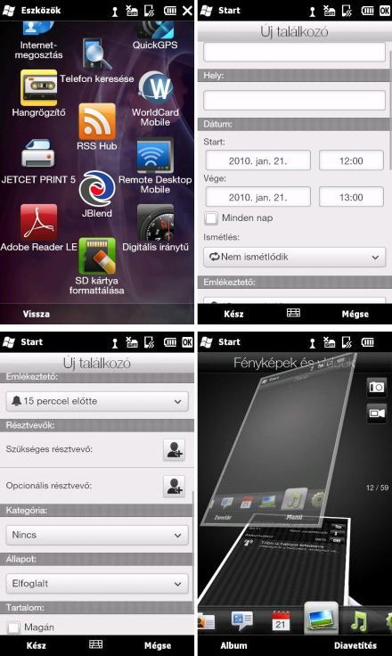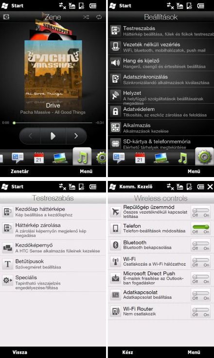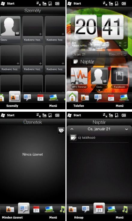 Ahogy említettük, a Sense UI fogad bennünket először a HTC HD2 mobilon bekapcsolás után. Ez gyakorlatilag egy olyan plusz kezelőfelület, amely nemcsak felhasználóbarát, elfeledteti a régi, berögzült WinMo utálatot, de számos funkciót és programot integrál magába, így gyakorlatilag 13 főképernyőnk van, amely mindegyike egy-egy külön munkára használható.