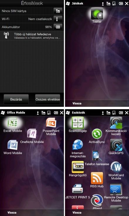 Nos azért a teljes menü nem érhető el a Sense-ből, olyan programokért, mint az Office Mobile, a YouTube kliens, a Windows Live, a Marketplace – ahonnan jó kis programokat töltögethetünk le -, a My Phone, a Bing kliens, valamint az Opera Mobile böngésző muszáj kicsit a Microsoft által kreált menüt is megismerni.