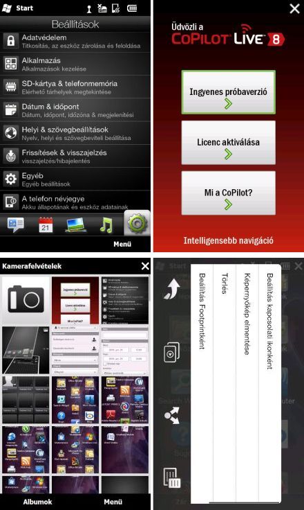 Adatkapcsolatra még microUSB van, Active Sync használata kötelező. Rögtön két böngészőt is találunk, az Internet Explorer a WinMo kötelező eleme, de inkább az adatmennyiség-csökkentő Opera Mobile-t javasolnánk, amelyen működik a fényképnézegetőben is megtalálható dual-touch zoomolás.
