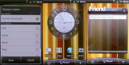 Ezeket bekapcsolva gyárilag előre telepítve választhatunk többféle lehetőségből, így megúszunk egy bő félórás, órás műveletet. A Legendben főképernyőn csak a menü gombot kell megnyomni, majd a Scenes-t kiválasztani és máris válogathatunk a HTC, a Social, a Work, a Play, a Travel, valamint a Clean Slate témák közül, ezek mindegyike más és más témára fókuszál widgetek és elérhetőségek terén.