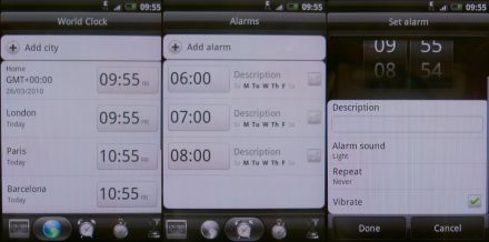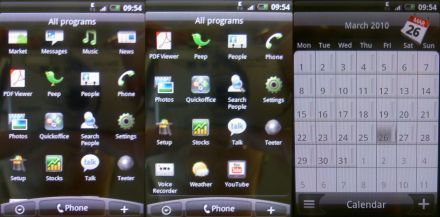 A főmenü a már rég ismert, több előre telepített program vár itt ránk, ám sok mindent szándékosan kihagytak és a felhasználóra bízzák a választást, hogy mit tölt le az Android Marketből. Van egyszerű számológép, egy igen megkapó dizájnt kapott naptár heti, havi és napi nézettel, jól konfigurálható találkozó rögzítéssel, valamint egy Desk Clock nevű program, ez kiírja az időt, az aktuális időjárási információkat, de akad több lapja is, ahol világóra, ébresztők, stopper és visszaszámláló fogad minket.