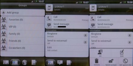 A telefonkönyvbe korlátlan számú kontakt menthető el, többféle adattal együtt. Ha megnyitjuk az adott kontaktot, akkor három kis fülecskén alul megtekinthetjük a nevét és számát, beállíthatunk hozzá csengőhangot és szerkeszthetjük, írhatunk neki üzenetet, valamint átnézhetjük a vele folytatott híváslistát. A telefonkönyvben a kapacitív érintőkijelzőnek és a kinetikus görgetésnek hála, nagyon könnyű a scrolling, a keresés. A kontaktok csoportba rendezhetők és itt találjuk a Facebook, Twitter, Flickr közösségi hálózatokhoz szükséges bejelentkezést, ami alapján pillanatok alatt frissíti a telefonkönyvi bejegyzéseket a telefon.