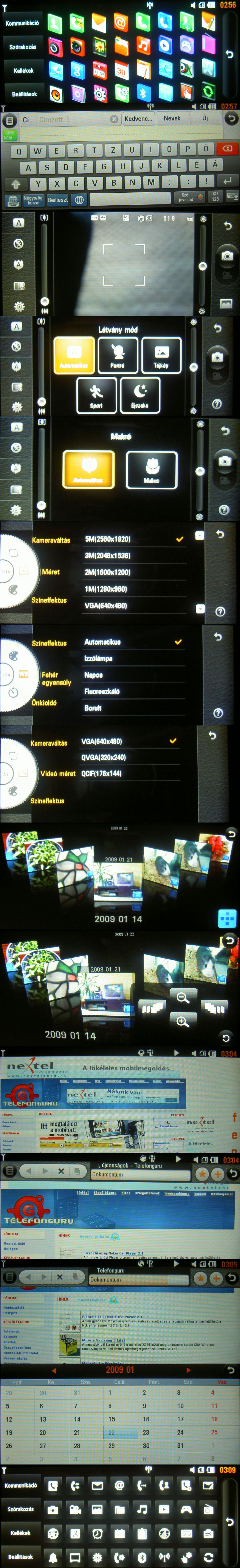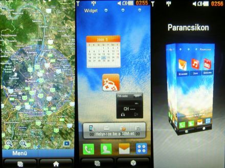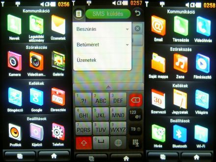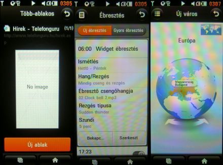 A négy főképernyő a parancsikon (ide kedvenc és sokat használt programjainkat tehetjük), a widget, a nevek (értelemszerűen sokat hívott kontaktjainkat érdemes kihelyezni, valamint a böngésző neveket kapták funkcióiknak megfelelően. Widgetek közül kirakható képernyőre a cellaüzenet, az analóg óra, a világóra két várossal, a naptár, az FM-rádió gyorsindítója, a jegyzet, a számológép, az időjárás, de egyszerre maximum nyolcat helyezhetünk el.