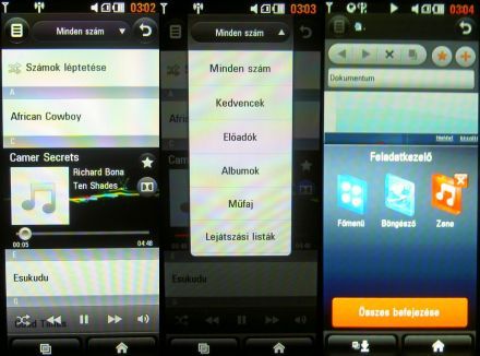 A zenelejátszó nemesen egyszerű, talán kissé túl fapados kezelőfelületű ehhez a készülékhez. A menübe lépve ABC sorrendben jelennek meg a számok, van hangszínszabályzó, háttérben futás, hallgathatjuk a zenéinket Bluetooth headseten vagy FM transmitter segítségével, beállíthatjuk kedvencnek és választhatunk a többféle zenelejátszó téma közül is (itt gyakorlatilag a mozgó háttér módosítható). Ne felejtsük el forgatni a mobilt, vadító így a lejátszó. A zenei részt az RDS-es FM-rádió egészíti ki, ehhez mindenképp szükség lesz a headsetre, hiszen az hivatott az antenna lenni.