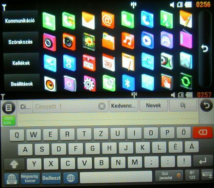 Érdekes az üzenetek új megoldása, amely egyértelműen a bitang széles (vagy magas) képernyőnek köszönhető. A bejövő üzenetekbe lépve ugyanis ha elforgatjuk a mobilt, akkor két részre osztja magát a menü, bal oldalra kerülnek az SMS-ek, jobb oldalra pedig a szövegük, így kissé Outlook-os fílinget kapunk (ennek pozitív vagy negatív értékelése egyéni szociális probléma). A szöveg begépelése kizárásos alapon virtuális billentyűzeten történhet, ez álló helyzetben numerikus, fektetve pedig QWERTY gombsor.