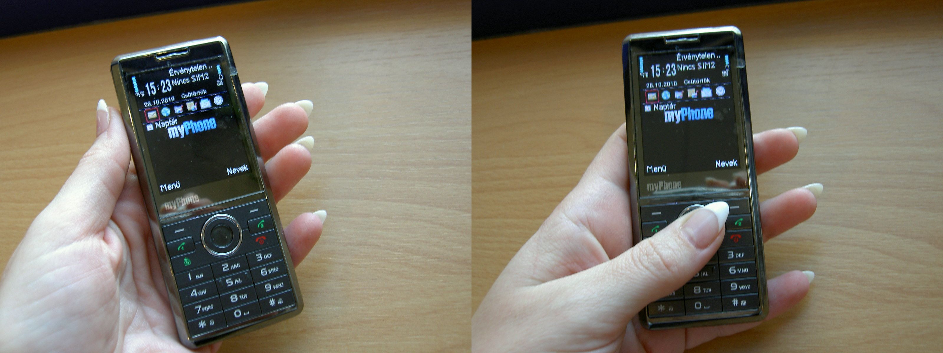 A kijelző alatt a szokásos elrendezésben találhatók a gombok, ezek jó nyomáspontúak és egyszerű őket kezelni, nem mellesleg még a gombsor is minőséginek néz ki. Az egész mobilon sehol egy rossz illesztés, nincs nyekergés, az ember el se hiszi, hogy myPhone márkájú telefont tart a kezében.