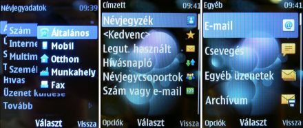 Az üzenetek menü végre nincs túlbonyolítva, az üzenetírás, bejövő és elküldött üzenetek láthatók, minden egyéb, amúgy ritkábban használt opció Egyebek címszó alatt fut (ilyen az integrált Nokia Messaging e-mail kliens, amihez bármilyen e-mail címet regisztrálhatunk, a csevegés, az egyéb üzenetek, valamint az archívum és a beállítások).