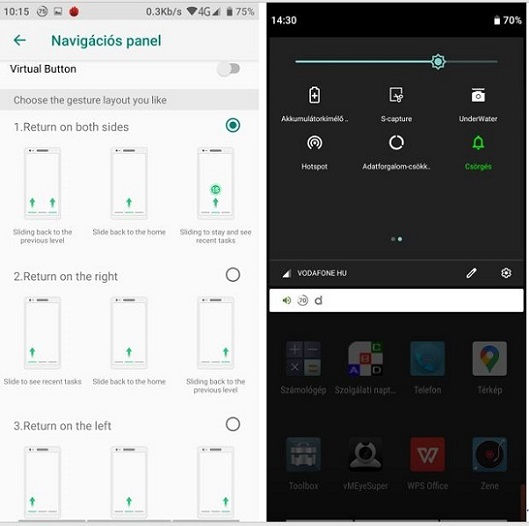 Külön említést érdemel a navigációs panel beállítása. Választhatunk a hagyományos virtuális gombok, vagy három féle gesztusvezérlés között, ami azért elég ritka és jó megoldás ebben a kategóriában.
