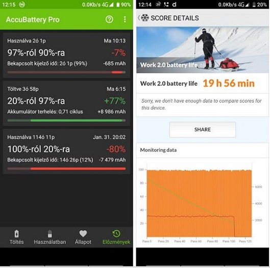 Kétórányi YouTube videónézés alatt 7%-ot csökkent a töltöttség. A Work 2.0 battery life tesztben 19 óra 56 perces eredményt produkált a mobil. Az akkumulátort feltölteni a mellékelt hálózati adapterrel, 20-ról 97%-ra 3 óra 58 perc alatt lehet. Érdekes, 80%-ra ,,pikk-pakk” feltölt (átlagosan 3805 mA a töltő áramerősség), majd utána csiga lassan vándorolnak az elektronok.
