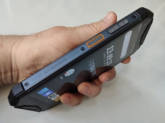 Baloldalra kerültek a hangerőszabályzók, valamint a programozható PTT (Push-to-talk) gomb a walkie-talkie funkcióhoz, ami azonban nem működik, mert ez a plusz antennával felszerelt, Armor 3WT privilégiuma. Azért nem marad kihasználatlan a narancsszínű kerettel körbevett gomb. Nálam például egyszeri nyomásra a kamerát, nyomva tartva a LED lámpát, kétszer megnyomva pedig a leggyakrabban használt alkalmazásomat indítja.