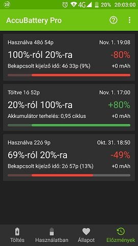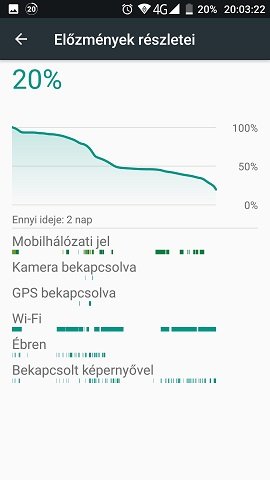 A hátlap nem pattintható le, így a 3680 mAh kapacitású Lithium-Polymer akkumulátort nem lehet cserélni. Az AccuBattery képernyőmentésen látható, hogy egy igazi éhezőművész a T1. Két nap, egészen konkrétan 48 óra és 54 perc működési idő, 4 óra 33 perc bekapcsolt kijelzővel nem igényel magyarázatot, nagyon jó. A Pump Express Plus 2.0 gyorstöltési technológia segítségével 20-ról 96%-ra 90 perc alatt tölthető fel, a maradék 4% eléréséhez további 22 percig kellett a töltőn hagyni. Kétórányi YouTube videónézés alatt 26%-ot merült a telefon.
