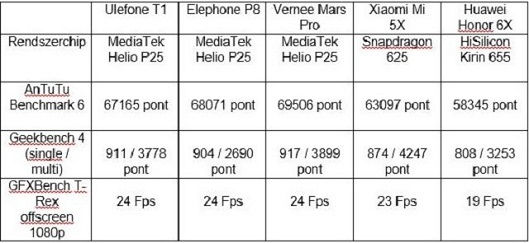 A táblázatban jól látható, hogy a Helio P25 chipset a Snapdragon 625 és a Huawei által használt Kirin 655 SoC közvetlen riválisa. A pontszámok alapján ugyan van eltérés, de a valós használat során gyakorlatilag megegyező a teljesítményük. Mindhárom SoC roppant takarékosan működik, emiatt előszeretettel alkalmazzák a felső-középkategóriás telefonokban.